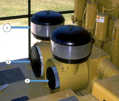Shown are the air intake system components. Located above the air filter housings are the precleaner bowls (1). Check the level of dirt accumulation in the precleaner bowls. Empty the precleaner bowls when the dirt level reaches the full mark.Service the air filters when the air filter restriction indicator located on the dash (see Slide No. 36) illuminates or when black exhaust smoke occcurs. The alert indicator lights when the filter restriction is approximately 7.5 kPa (30 in. of water).